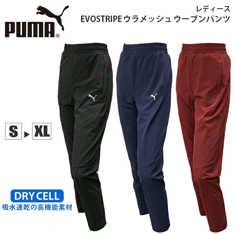 プーマ レディース ウーブンパンツ PUMA 853838 EVOSTRIPE 裏メッシュ ウーブン パンツ | スポーツ ブランド ウェア ボトムス ズボン ロングパンツ 黒 ブラック 紺 ネイビー 赤 レッド ストレッチ 伸縮 伸びる ドライ 吸汗 速乾 快適 春 秋 冬 ウォーキング ランニング ジム